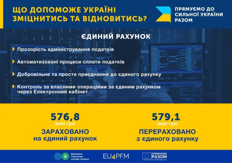 Використання для сплати податків єдиного рахунка, який запрацював з 2021 року, набуває все більшої популярності. Так, з початку 2022 року на єдиний рахунок зараховано 576,8 млн гривень.