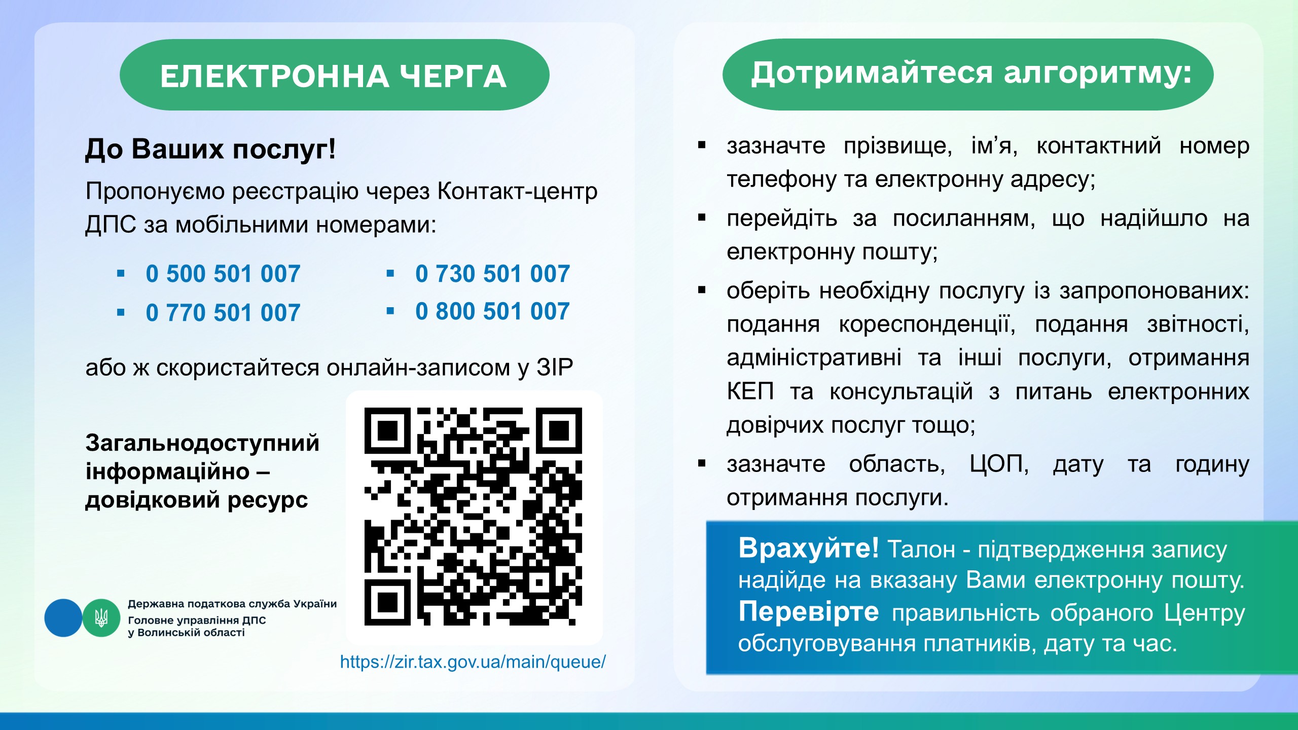 або ж скористайтеся онлайн-записом на вебпорталі ДПС та Загальнодоступному інформаційно - довідковому ресурсі за посиланням: https://zir.tax.gov.ua/main/queue/.