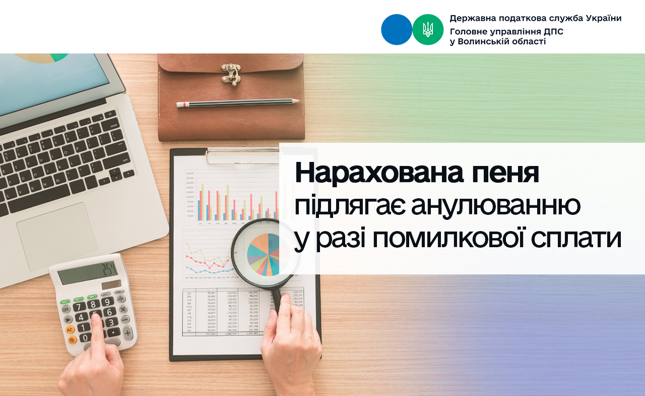 Головне управління ДПС у Волинській області звертає увагу, що відповідно до Закону України від 23.02.2024 р № 3603-ІХ «Про внесення змін до Податкового кодексу України та інших законів України», п. 129.9 ст. 129 Податкового Кодексу України доповнено п.п. 129.9.8 та встановлено, що пеня не нараховується, а нарахована пеня підлягає анулюванню у разі помилкової сплати платником податків, у тому числі податковим агентом, грошового зобов’язання на інший бюджетний рахунок (без порушення законодавчо визначеного строку сплати податку або узгодженої суми грошового зобов’язання до бюджету).