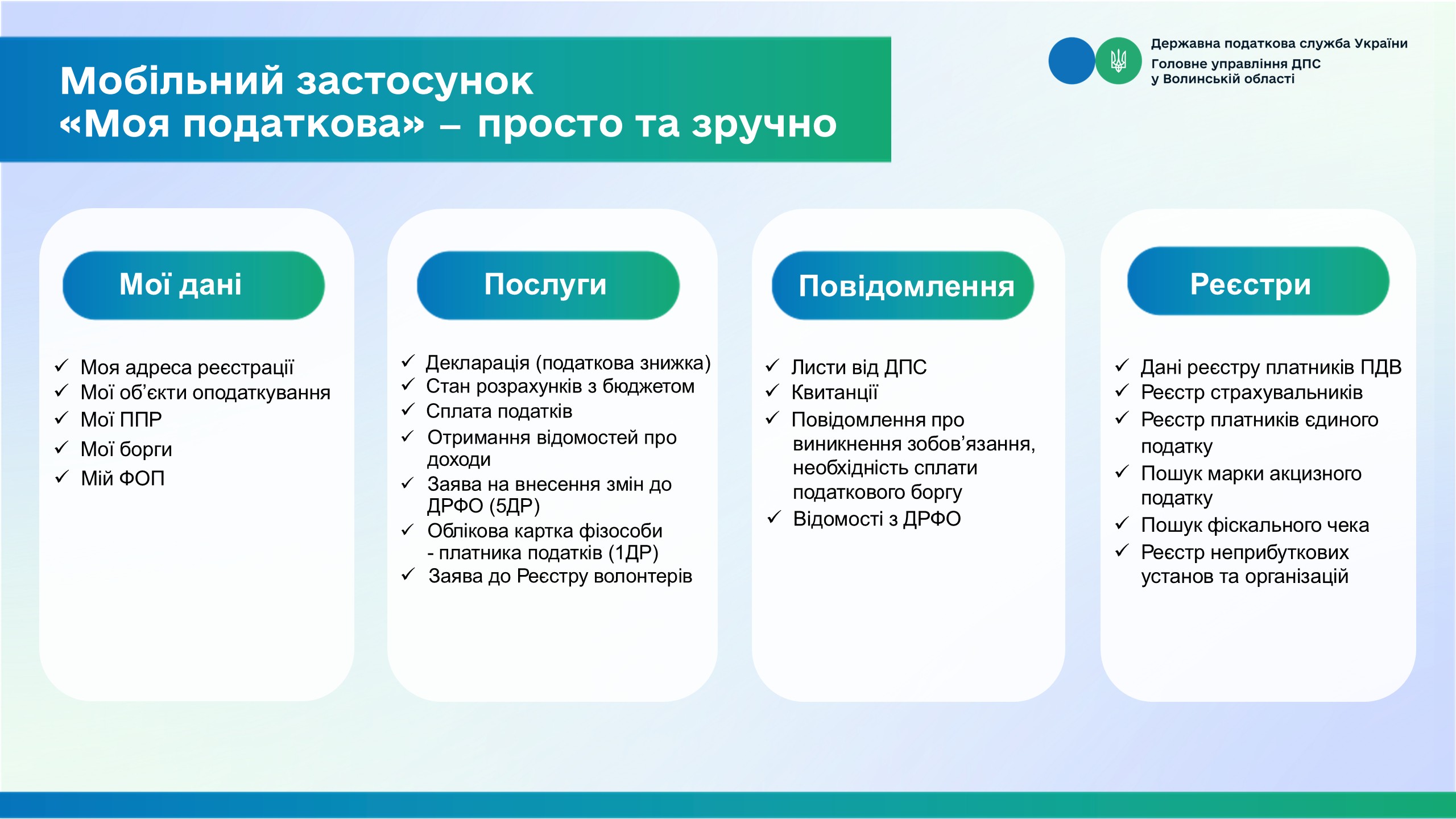 Мобільний застосунок «Моя податкова» надає можливість швидко отримувати необхідну інформацію, подавати заяви та податкові декларації, сплачувати податки.