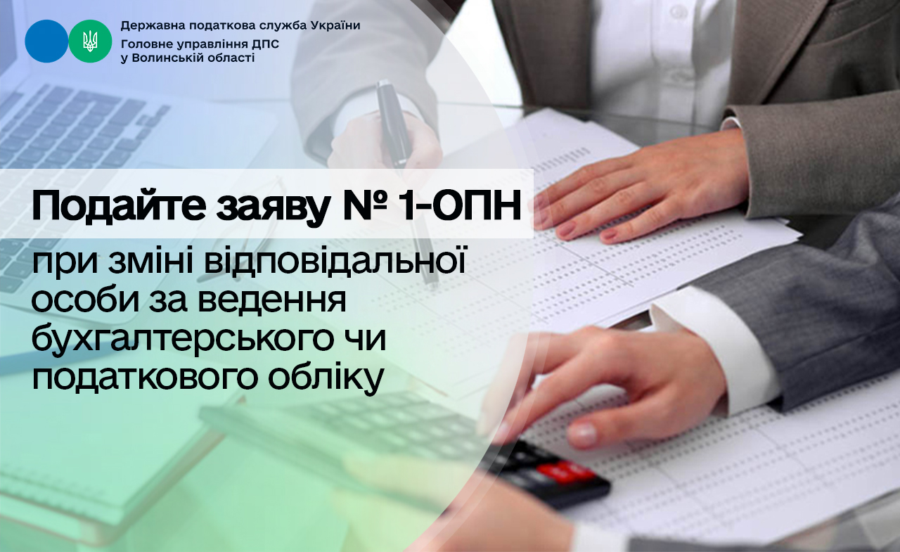 З цією метою до ДПС подається заява за формою № 1-ОПП з позначкою "Зміна відповідальних осіб: особи, відповідальної за ведення бухгалтерського та/або податкового обліку".