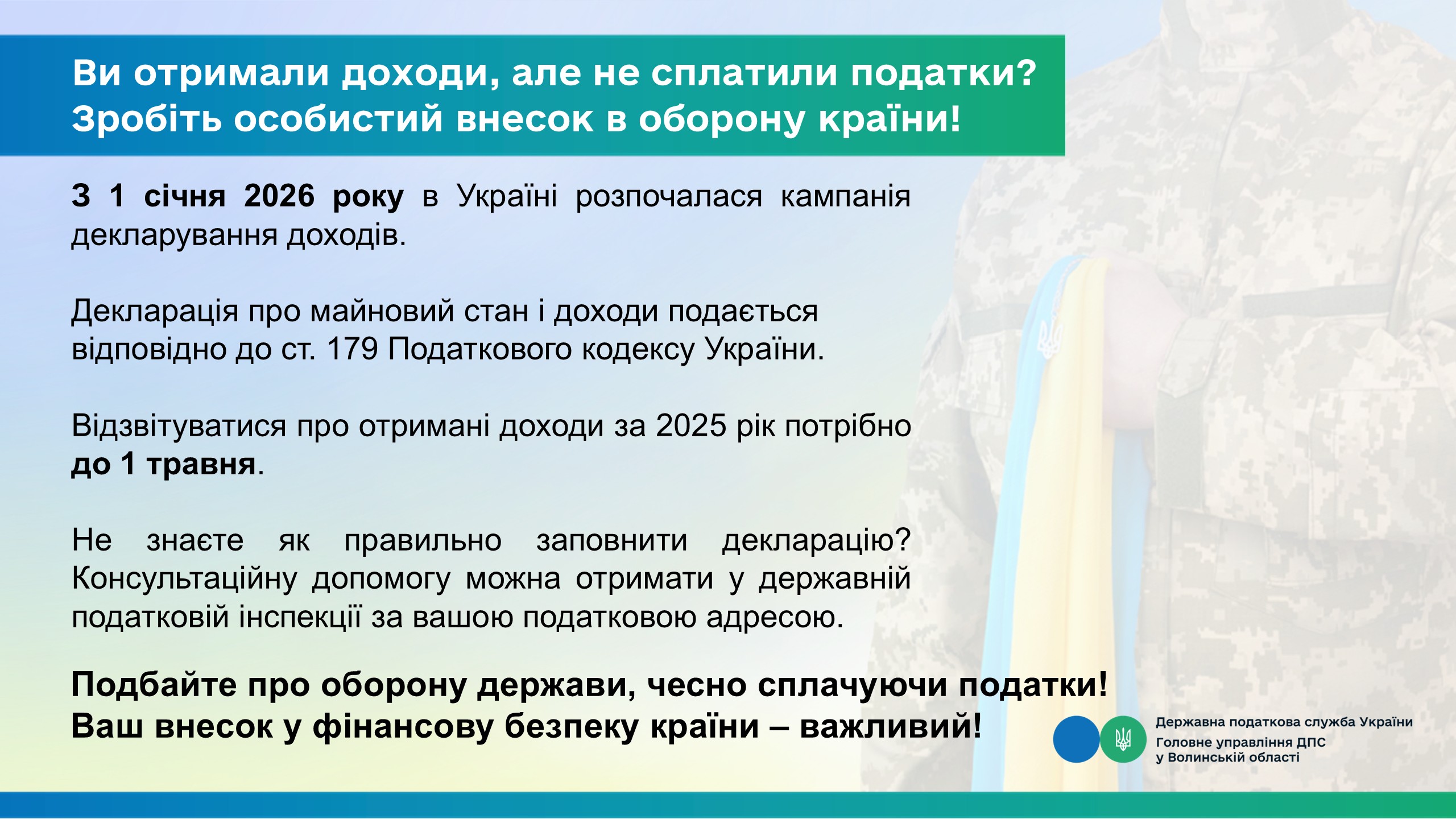 Подбайте про оборону держави, чесно сплачуючи податки! Ваш внесок у фінансову безпеку країни – важливий!